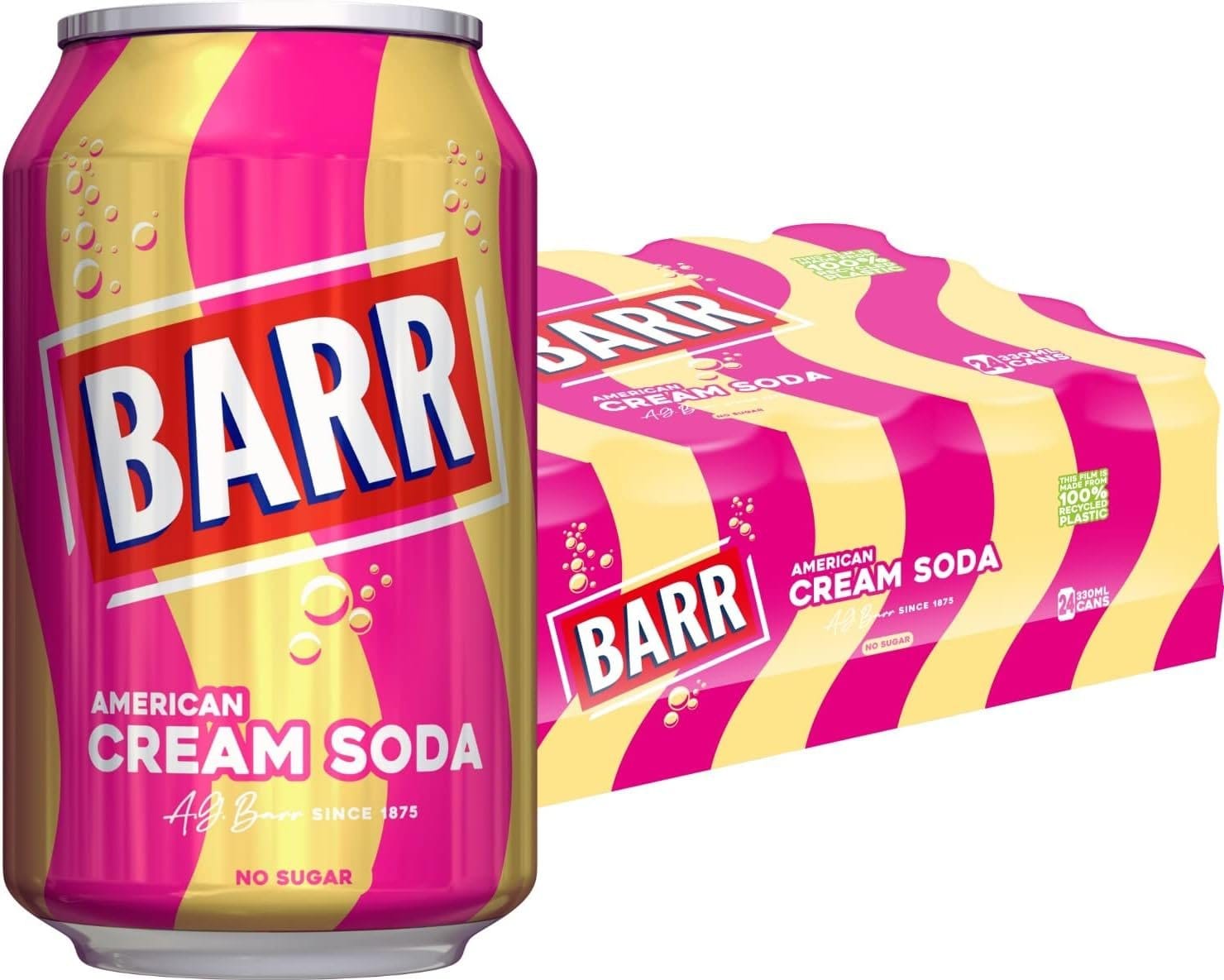 【Buy 2 Get 1 Free】BARR since 1875, American Cream Soda, No Sugar Sparkling Soft Drink with a Creamy Taste of American Cream Soda, “Fizzing with Fun” – 24 x 330ml Cans