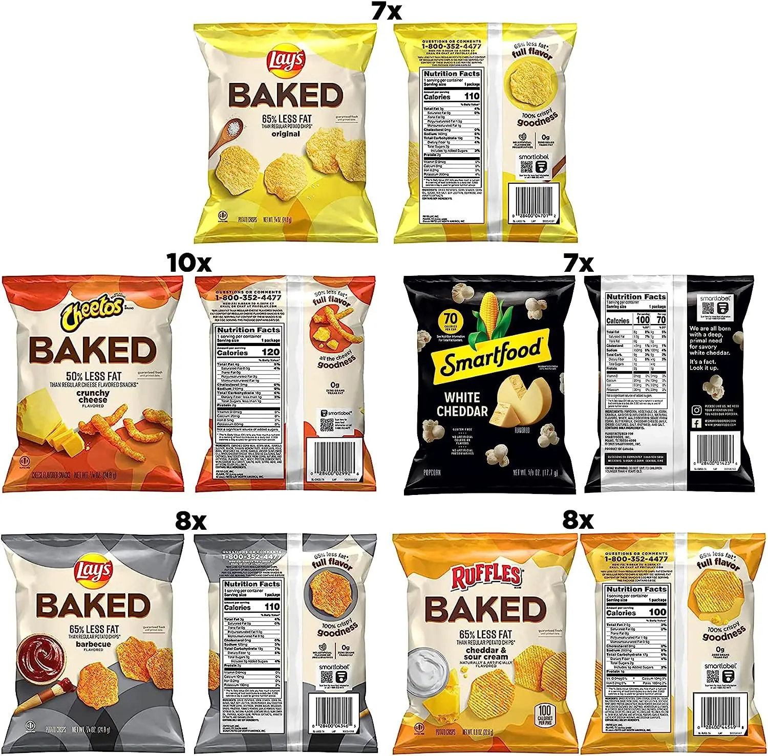 • New assortment includes 40 single serve bags: (10) Baked Cheetos Crunchy, (7) Baked Lay’s Classic, (8) Baked Lay’s Barbecue, (8) Baked Ruffles Cheddar Sour Cream, and (7) Smartfood White Cheddar Popcorn