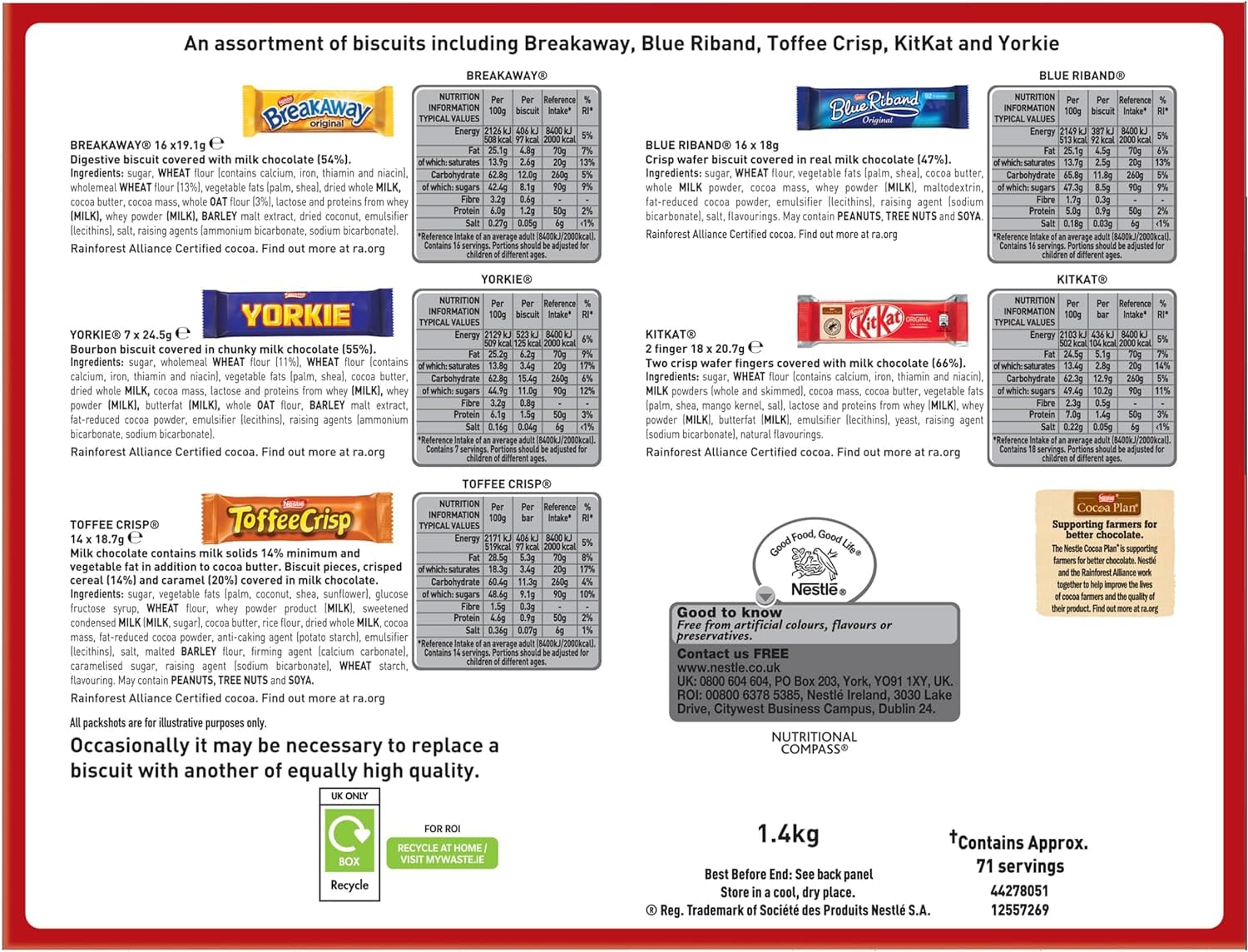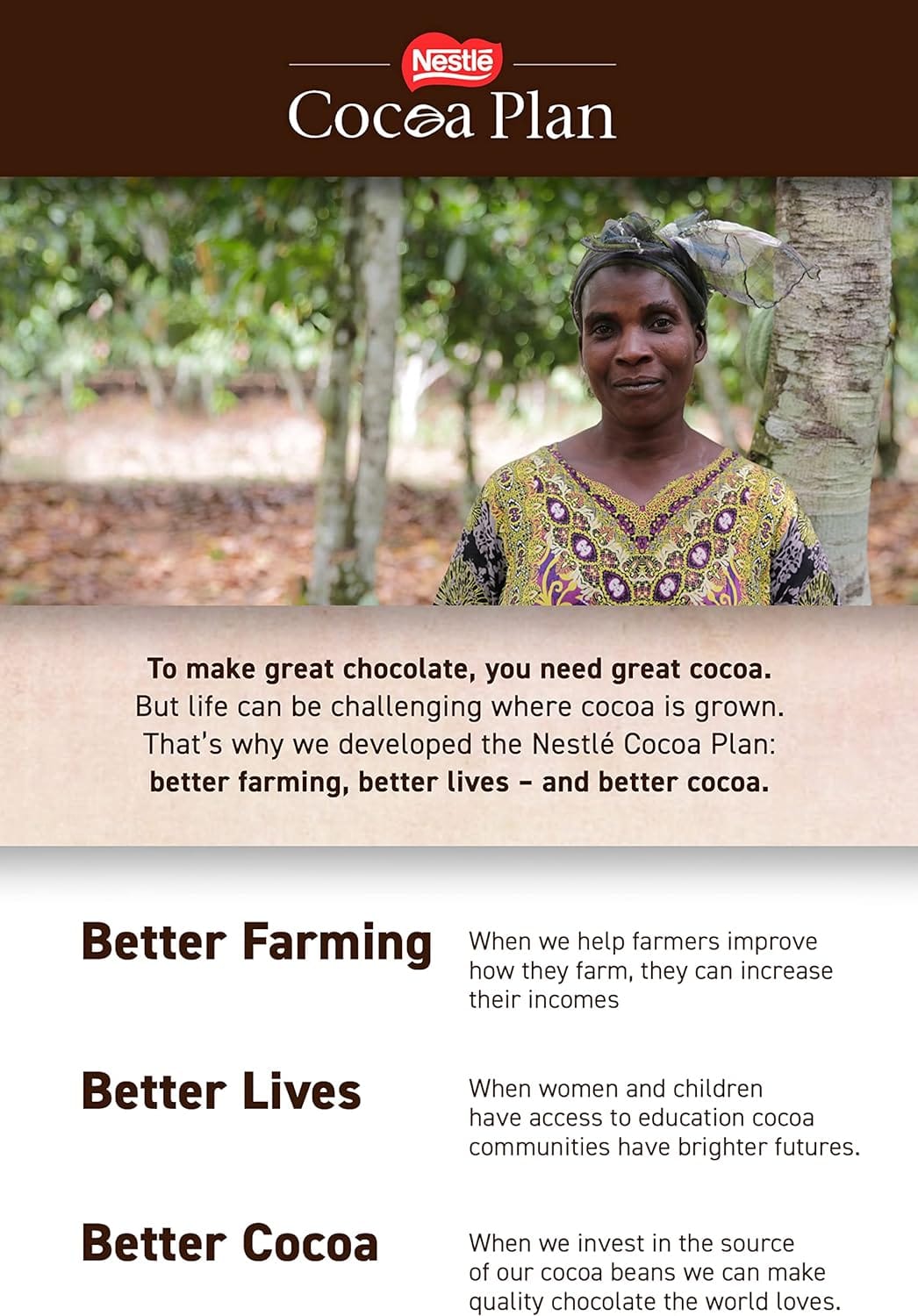 | Nestlé and the Rainforest Alliance work together to help improve the lives of cocoa farmers and the quality of their products. | Nestlé Cocoa Plan is supporting farmers for better chocolate. | The Big Biscuit Box by Nestle contains an assortment of 71 Chocolate biscuit bars. |
